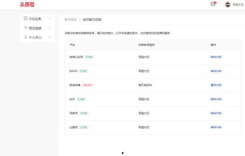 你有没有想过,你的头条号可以像蜘蛛侠一样,同时关联好几个账号呢?没错,这就是今天我要跟你分享的神奇秘密!想象你可以在一个平台上管理多个账号,是不是感觉瞬间高大上了呢?那么,头条号到底可以关联几个账号呢?让我们一起揭开这个神秘的面纱吧!